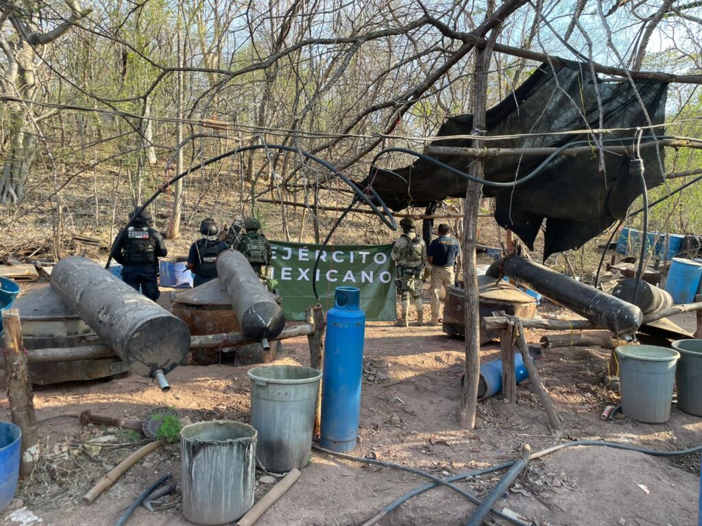 El predio fue detectado sobre un camino de terracería de la localidad de Baztán del Cobre, donde aseguraron 155 tambos con sustancias químicas . Además, 50 bidones de 50 litros, también con sustancias utilizadas para la elaboración de drogas sintéticas. De igual forma, se encontraron 24 cilindros de gas, 17 ollas de peltre tipo vaporera, 120 bultos de sosa cáustica y 80 tambos.