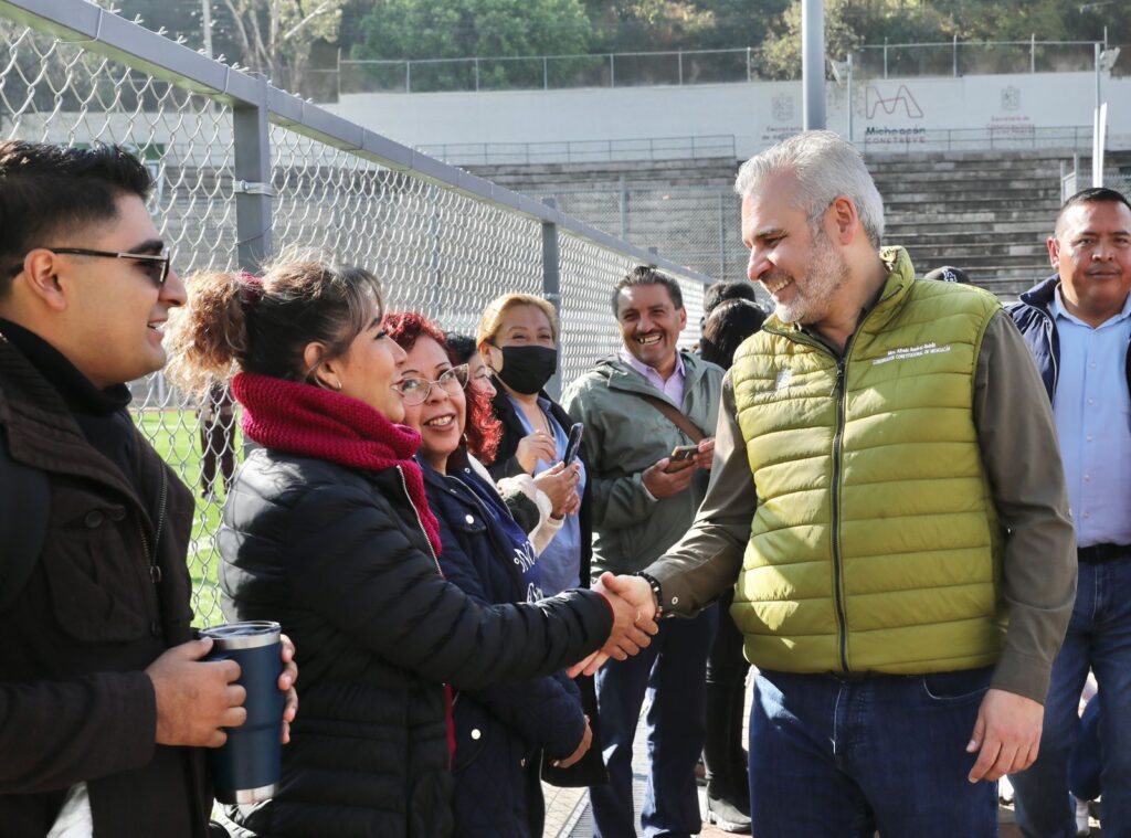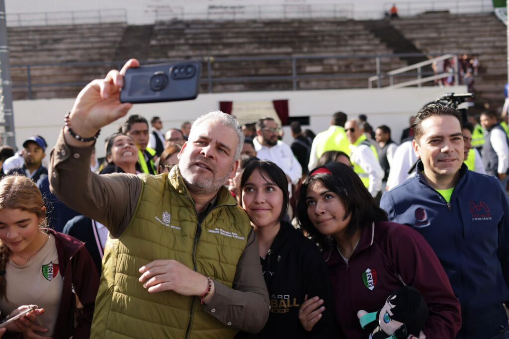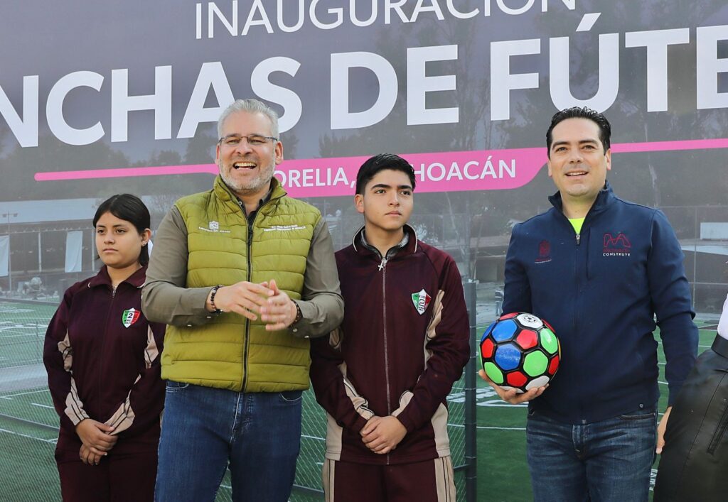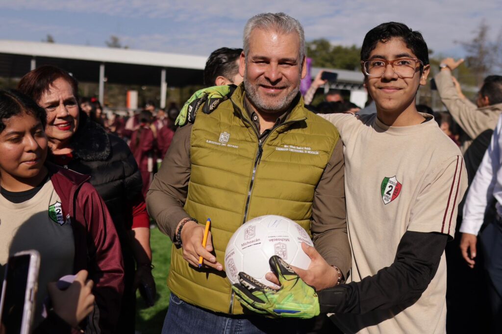 Morelia, Michoacán, 10 de diciembre de 2025.- Para impactar de manera positiva en el desarrollo físico, social, emocional y académico de las y los estudiantes, el gobernador Alfredo Ramírez Bedolla dio la patada inaugural de dos canchas de fútbol 7 en la Escuela Secundaria Federal No. 2 “Hermanos Flores Magón”.