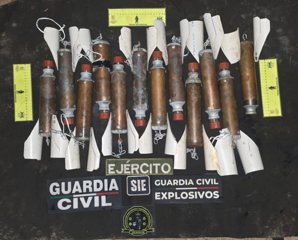 Tuzantla, Michoacán, 17 de junio de 2025.- Elementos de las secretarías de Seguridad Pública (SSP) y de la Defensa Nacional (Defensa) localizaron 12 artefactos explosivos en el municipio de Tuzantla, mismos que fueron destruidos, como resultado de los trabajos encaminados a la localización y desactivación de dichos dispositivos en la entidad.