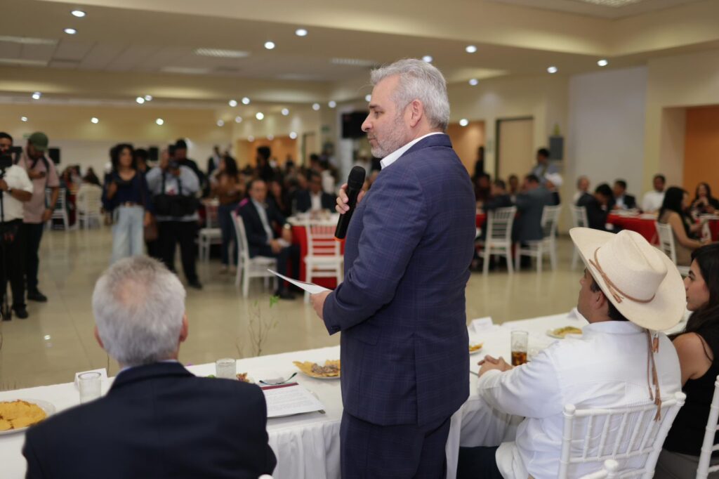 Uruapan, Michoacán, 21 de octubre de 2025.- El gobernador Alfredo Ramírez Bedolla recibió el reconocimiento Fray Juan de San Miguel, que entrega cada año el periódico ABC de Michoacán en el marco de su aniversario, de manos de su presidente y director general, Pedro Andrade González.