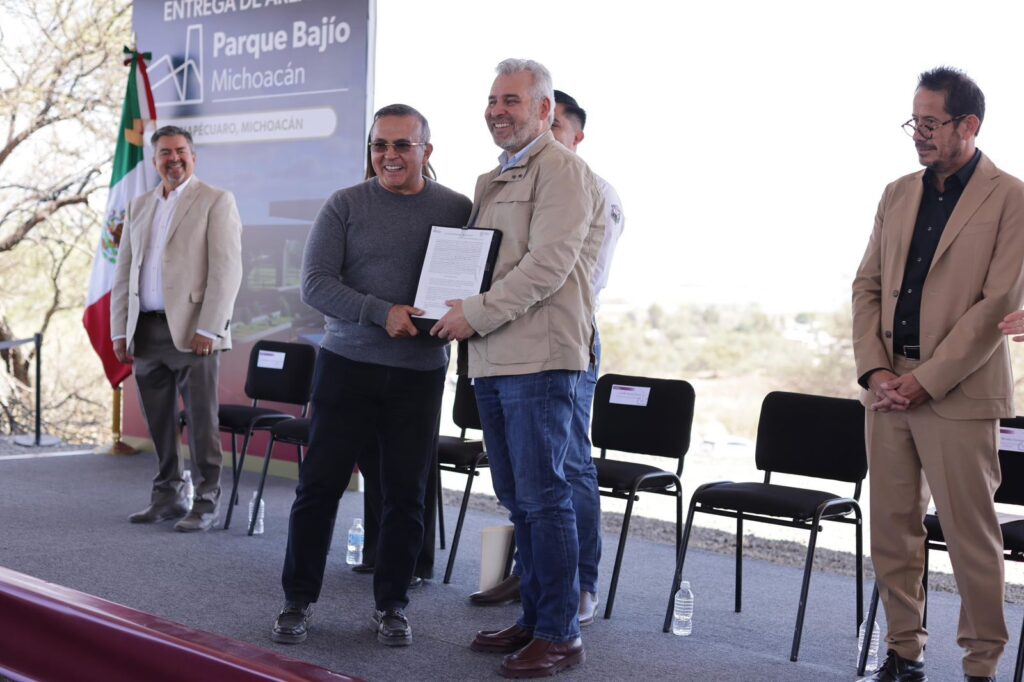 Zinapécuaro, Michoacán, 30 de enero de 2026.- El gobernador Alfredo Ramírez Bedolla entregó a José Luis Solórzano, de Grupo Herso, y a Eduardo Ramírez Díaz, de Citelis, las dos primeras áreas del Parque Bajío donde desarrollarán obras de infraestructura con una inversión superior a los 6 mil 300 millones de pesos. Las empresas también estarán a cargo de la promoción y atracción de inversiones a este parque industrial, ubicado en el municipio de Zinapécuaro.