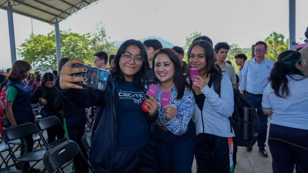 Uruapan, Michoacán, 16 de abril de 2026.- La secretaria de Desarrollo Urbano y Movilidad, Gladyz Butanda Macías, entregó tarjetas prepago de transporte público a estudiantes del Colegio de Estudios Científicos y Tecnológicos de Michoacán (Cecytem) plantel Uruapan, previo a la inauguración de este medio de transporte aéreo.
