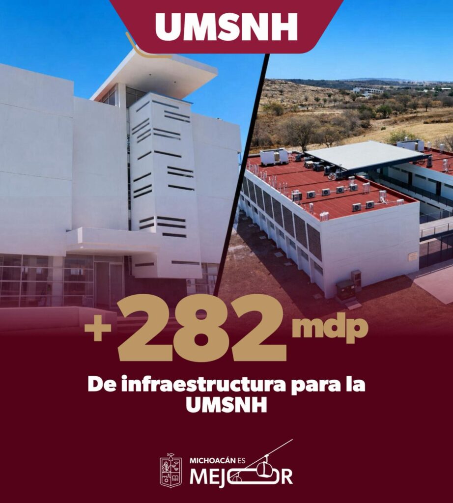 Además, en la capital michoacana se han realizado trabajos de rehabilitación, ampliación y modernización, asegurando espacios dignos por 106 millones 368 mil pesos, a fin de mejorar las instalaciones de la Máxima Casa de Estudios.