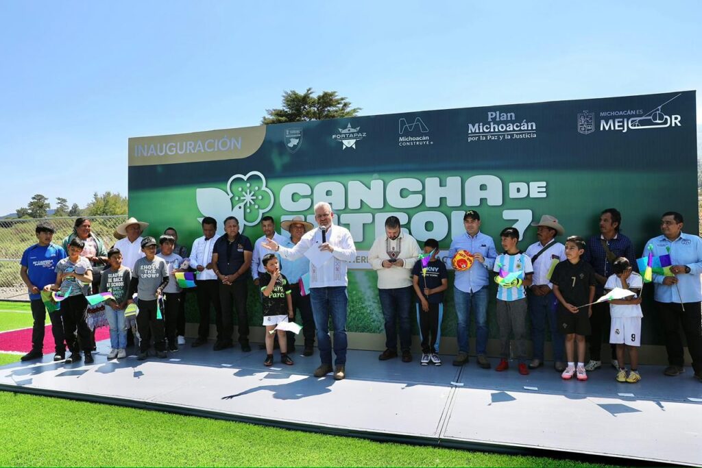 Charapan, Michoacán, 8 de marzo de 2026.- El gobernador Alfredo Ramírez Bedolla inauguró en la comunidad indígena con autogobierno de San Felipe de los Herreros, una cancha de futbol 7, para beneficio de más de 13 mil 500 habitantes, como parte de la estrategia estatal de recuperación de espacios públicos para la prevención del delito.