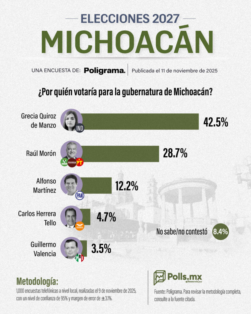 Morelia, Michoacán.– Grecia Quiroz, viuda del alcalde de Uruapan, Carlos Manzo, encabeza las preferencias rumbo a la gubernatura de Michoacán con un 43% de intención de voto, de acuerdo con el más reciente sondeo realizado por la encuestadora Poligrama.