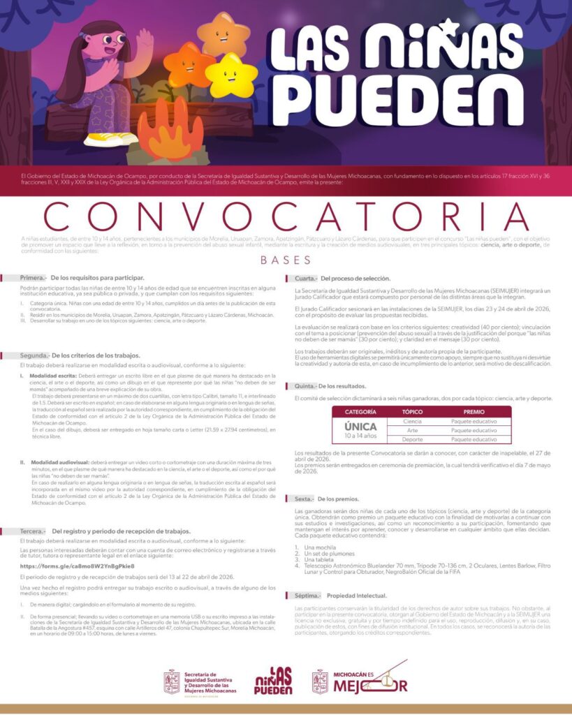 Con iniciativas como “Las Niñas Pueden”, la Seimujer reafirma que construir un Michoacán más justo implica escuchar a las niñas, abrirles espacios de expresión y recordarles, desde la infancia, que sus ideas, sueños y voces importan. Las bases completas se pueden consultar a través del enlace: https://mujer.michoacan.gob.mx/convocatorias/las-ninas-pueden/.