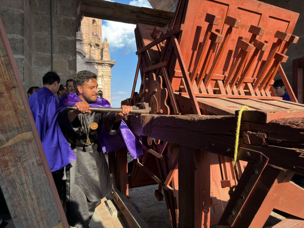 Morelia, Michoacán, 3 de abril de 2026.- Michoacán resguarda una de las expresiones más singulares del patrimonio religioso y cultural del país: la matraca monumental. Está ubicada en la torre poniente de la Catedral de Morelia, y es considerada la única en su tipo que continúa en funciones en todo México. Este instrumento tradicional forma parte esencial de las celebraciones de Semana Santa.