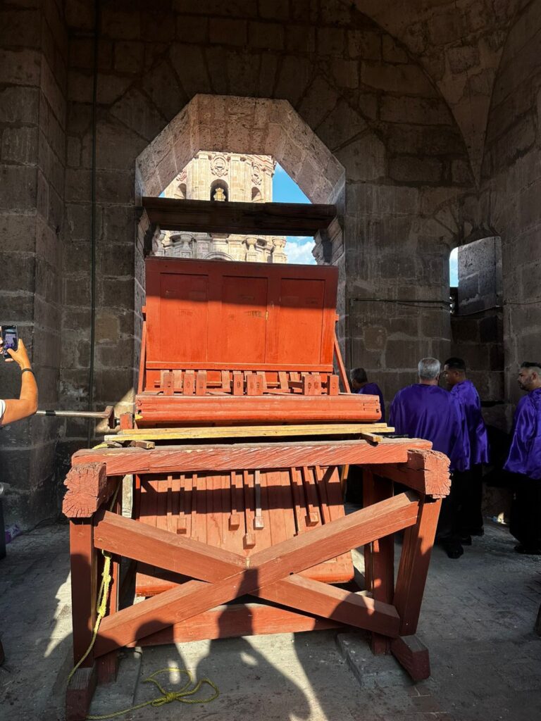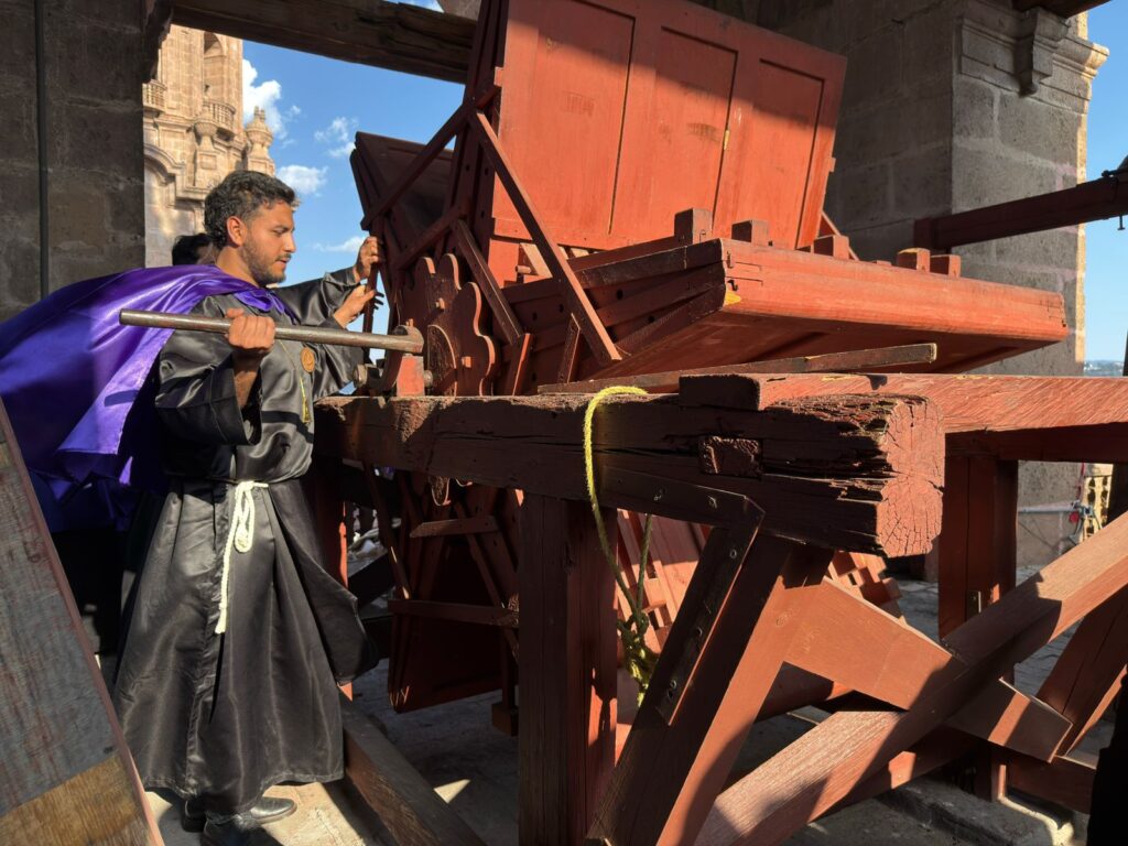 El titular de Sectur enfatizó que la matraca monumental fue instalada en 1856 y destaca por su compleja estructura, ya que cuenta con seis cajas de resonancia, dos manivelas con forma de estrella y nueve mazos, elementos que en conjunto generan su característico sonido que anuncia solemnidad y recogimiento.