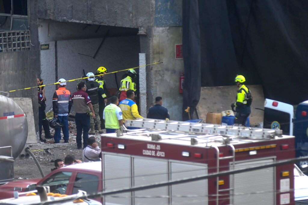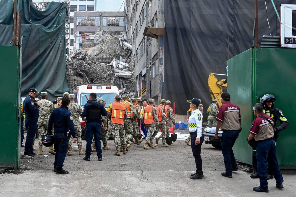 Equipos del Heroico Cuerpo de Bomberos de la Ciudad de México y personal de emergencia continúan con las labores de búsqueda entre los escombros, apoyados por binomios caninos y maquinaria ligera, mientras el área permanece acordonada.