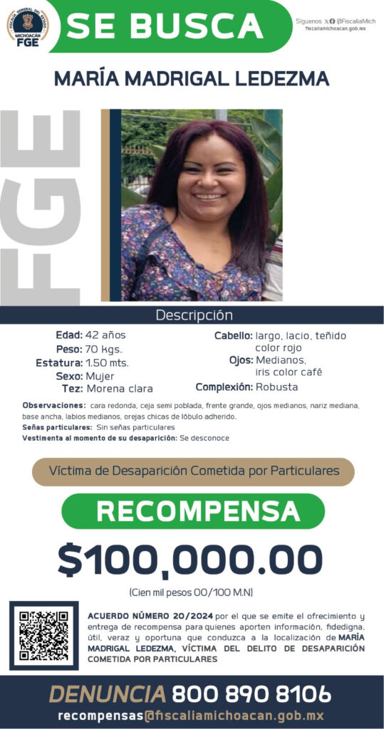 Por lo anterior y de conformidad con las atribuciones que le confiere la Ley Orgánica de la Fiscalía General del Estado de Michoacán para el Ofrecimiento y Entrega de Recompensas, el Fiscal General, Adrián López Solís, firmó el acuerdo 20/2024 de ofrecimiento y entrega de 100 mil pesos de recompensa, por la información que conduzca a la localización de María Madrigal Ledezma.