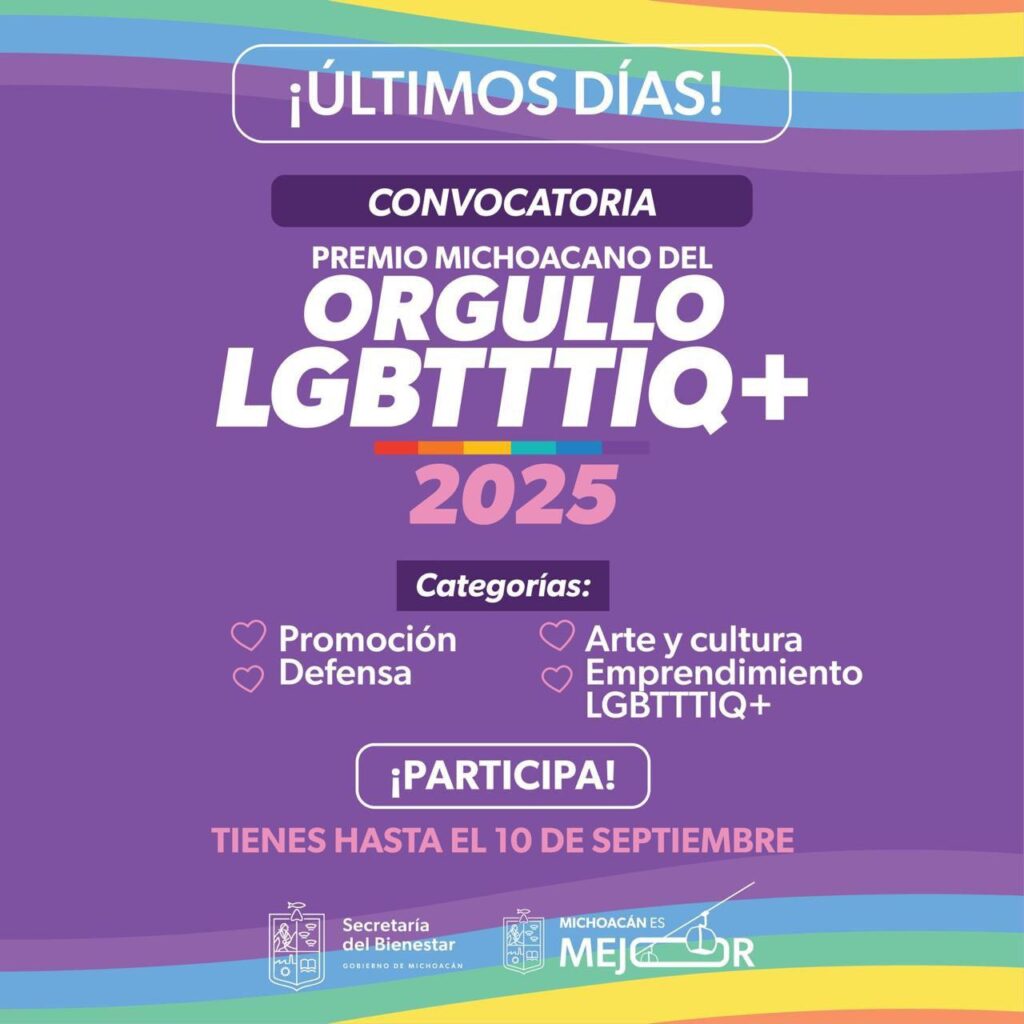 Pueden participar personas mayores de 18 años, originarias de Michoacán o que residan en alguno de los municipios de la entidad. Hay tres categorías: Promoción y Defensa, Arte y Cultura, y Emprendimiento LGBTTTIQ+. Pueden consultar las bases completas en el enlace https://bienestar.michoacan.gob.mx/premio-michoacano-del-orgullo-lgbtttiq-2025/.
