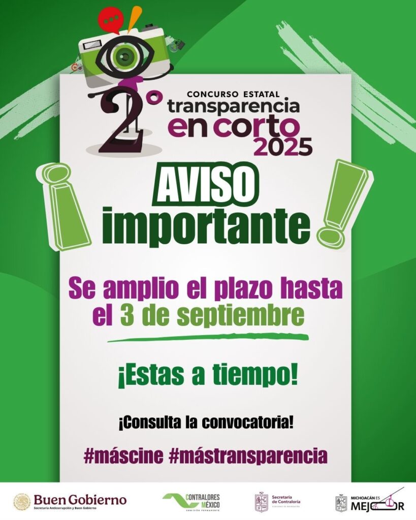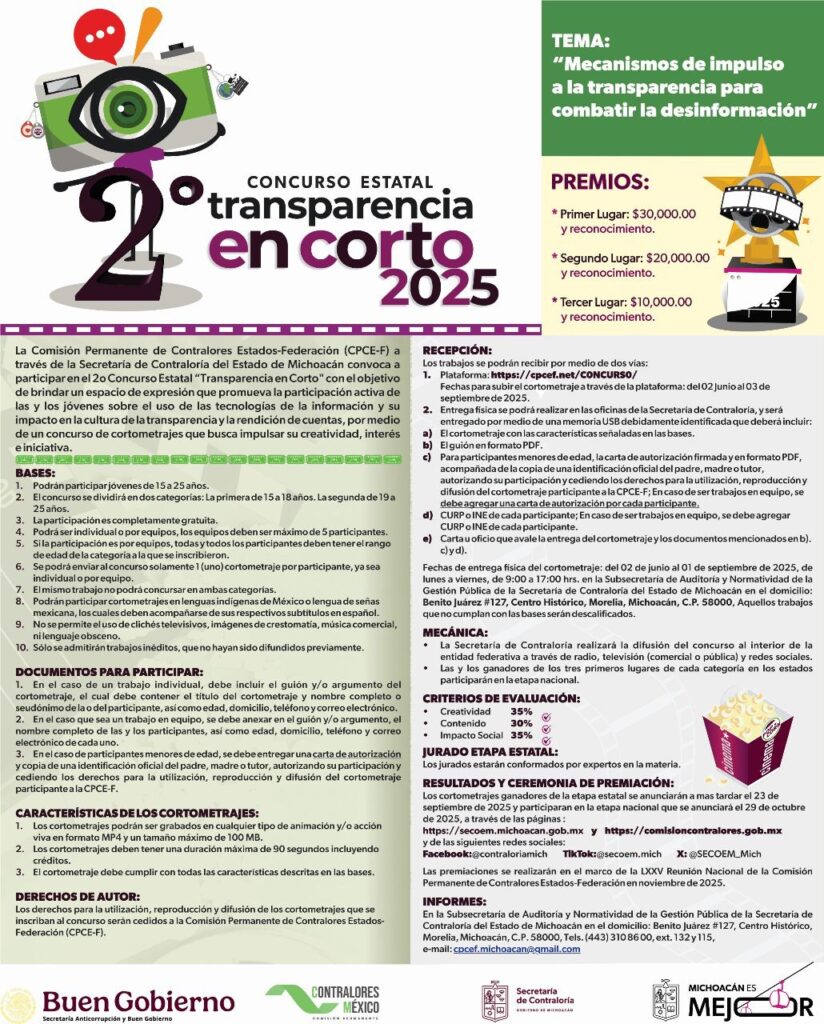 Morelia, Michoacán, 27 de agosto de 2025.- Si tienes entre 15 a 25 años aún estás a tiempo para participar en el Concurso Transparencia en Corto 2025, impulsado por la Secretaría de Contraloría de Michoacán, con el objetivo de fomentar la cultura de la transparencia, la rendición de cuentas y el combate a la corrupción.