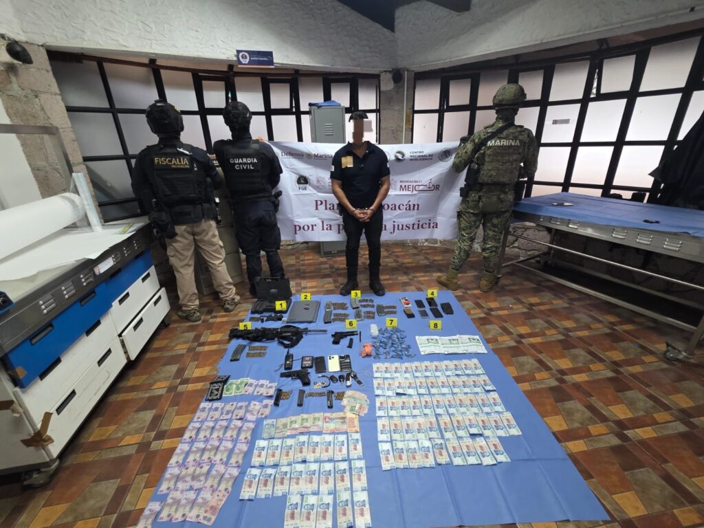 Jungapeo, Michoacán, 15 de enero del 2026.- En apoyo a la Fiscalía General del Estado (FGE) para la cumplimentación de una orden de cateo en el municipio de Jungapeo, se detuvo a un hombre y se aseguraron dos armas de fuego, una réplica de pistola tipo escuadra, siete vehículos y 24 dosis de metanfetamina. En la acción participaron agentes de las secretarías de Seguridad Pública (SSP) y de la Marina (Semar).